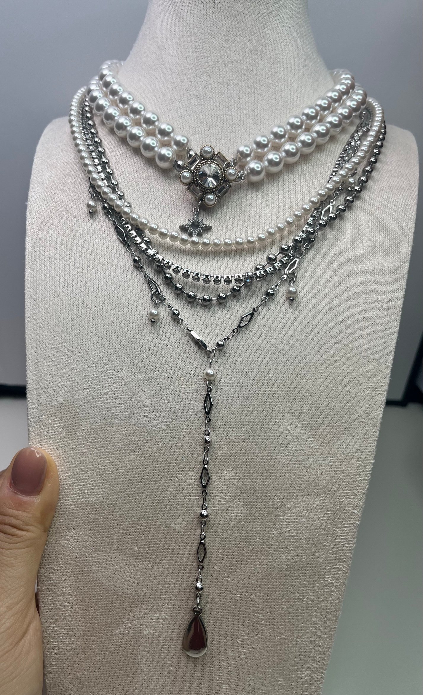Size: Choker length is 38cm+6cm extender,A Necklace length is 41cm+6cm extender.B long Necklace length is 45cm+6cm extender.Imitation Pearl is 8-9mm.